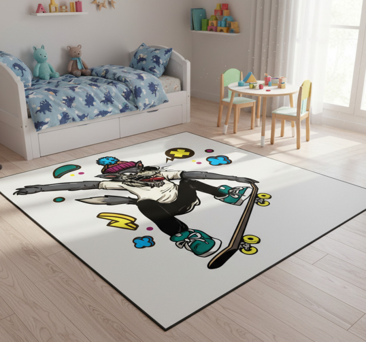 Referencia: R20020Transforma cualquier espacio con la Alfombra vinílica animales lobo sobre patineta, un diseño vibrante que captura la esencia de la aventura. Esta hermosa alfombra presenta un lobo audaz montando una patineta, rodeado de colores llamativos y detalles que evocan la libertad y la diversión. Perfecta para habitaciones infantiles o áreas de juego, su estilo único anima el ambiente y despierta la imaginación.