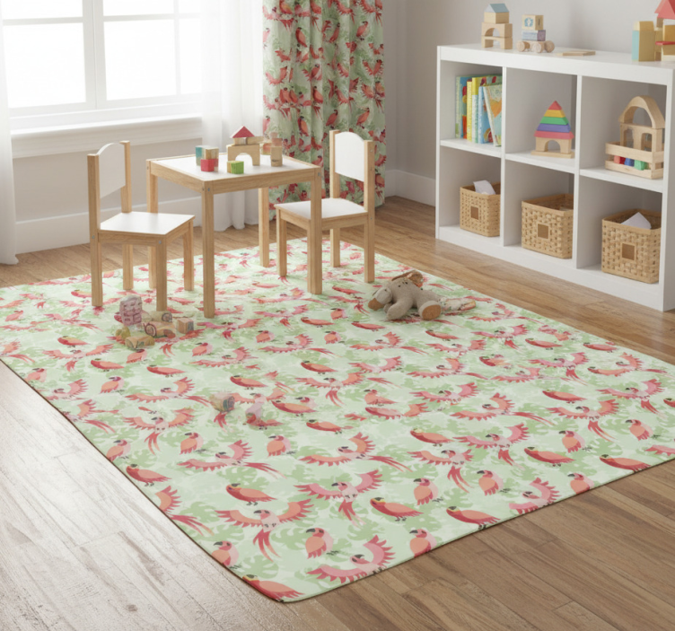 Alfombra vinílica animales pájaros rojos en hojas verdes