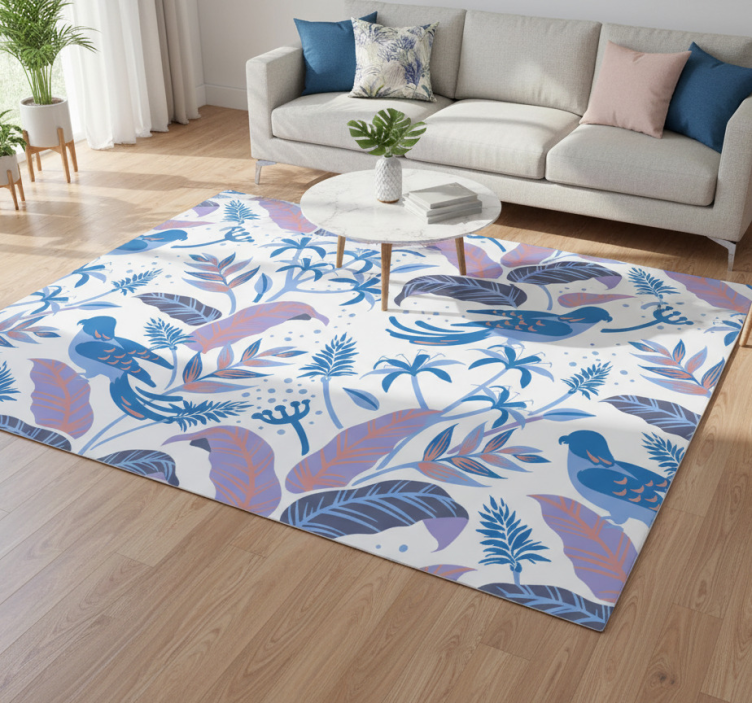 Alfombra vinílica flores aves azules y rosas sobre hojas