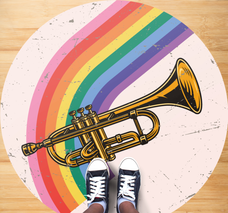 - Alfombra de vinilo arcoíris y trompeta dorada