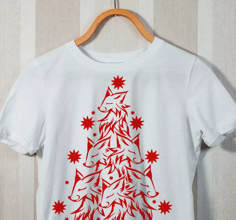 Referencia: T5438Este diseño festivo único presenta cabezas de lobo dispuestas de manera intrincada en una formación de pirámide, complementadas con motivos de estrellas. El vibrante color rojo resalta contra el fondo blanco, convirtiéndolo en una pieza llamativa perfecta para la temporada navideña.