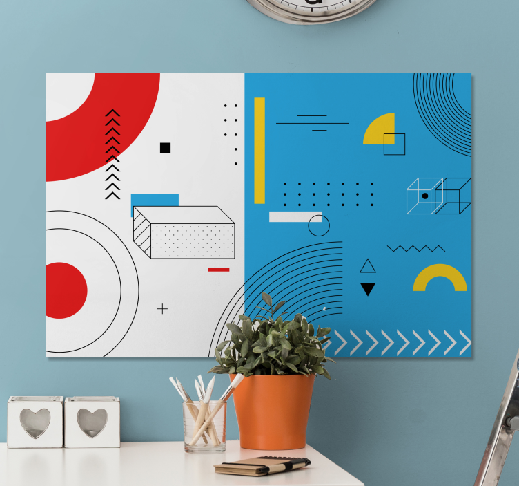 Este cuadro figuras geométricas composición de formas se destaca por su diseño abstracto, donde las formas y la geometría se entrelazan en una danza de círculos, triángulos, rectángulos y flechas. Con un patrón de topos y un estampado vibrante, esta obra captura la esencia del arte moderno, aportando un toque de frescura y creatividad a cualquier espacio. ¡No hay nada como un cuadro que hable por sí mismo!