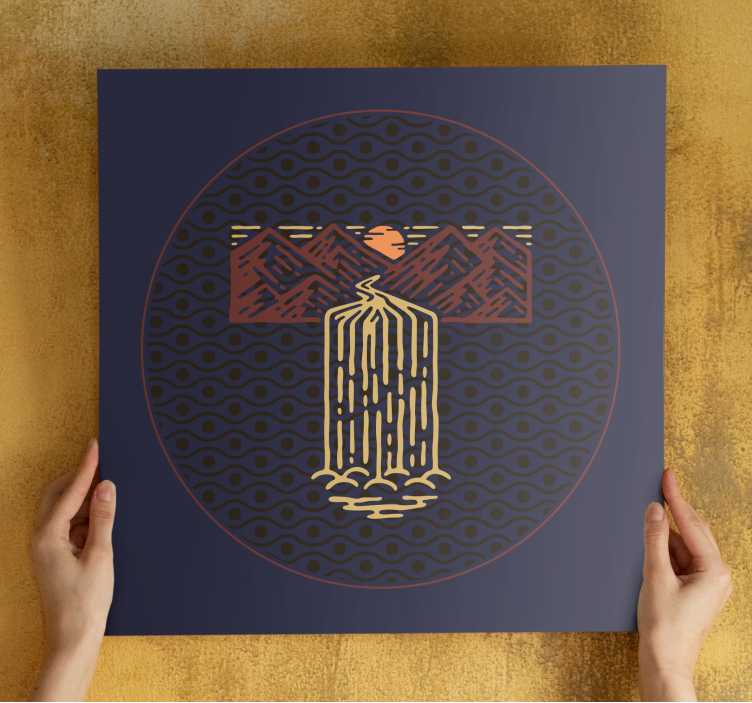 Descubre la belleza de la naturaleza con nuestro Cuadro paisajes paisaje de cascada serena. Este diseño gráfico cautivador presenta una cascada rodeada de montañas bajo un sol radiante, combinando tonos púrpuras, lilas y morados. Con un patrón geométrico y minimalista, este dibujo africano en forma de ronda ofrece un estilo abstracto que refleja la serenidad del atardecer entre las montañas. La imagen se extiende a lo largo del marco, creando un efecto visual infinito que conecta con la naturaleza.