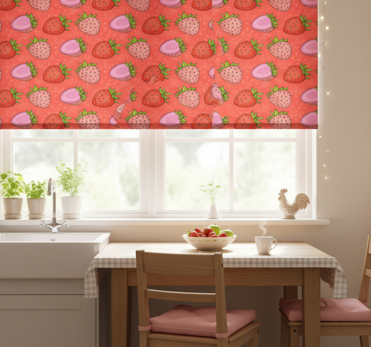 Cortina roller cocina fresas rojas y rosas