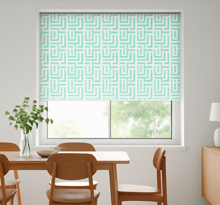 Cortina roller comedor efecto de cuadrados geométricos azules