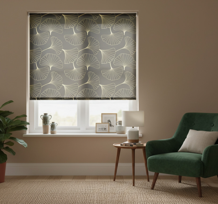 Cortina roller moderno hojas de ginkgo charcoal gold
