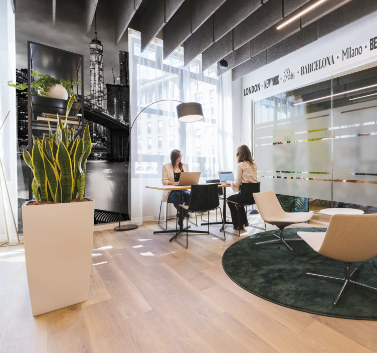 Referencia: F12189Un espacio de oficina moderno presenta a dos personas involucradas en una reunión, con un impresionante mural de la línea del horizonte de la ciudad que muestra monumentos icónicos. Una planta vibrante añade un toque de naturaleza, mejorando el entorno interactivo. El diseño enfatiza una mezcla de vida urbana y colaboración profesional.