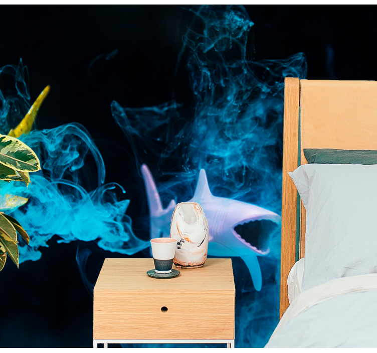 Descubre la magia de nuestro Mural de animales ilustración de tiburón colorido, un diseño vibrante que captura la esencia del océano. Con un tiburón nadando entre aguas azules, rodeado de humo etéreo, este fotomontaje resalta la vida marina y el mundo submarino. ¡Es un verdadero festín visual para los amantes de lo marítimo y los marineros de corazón!