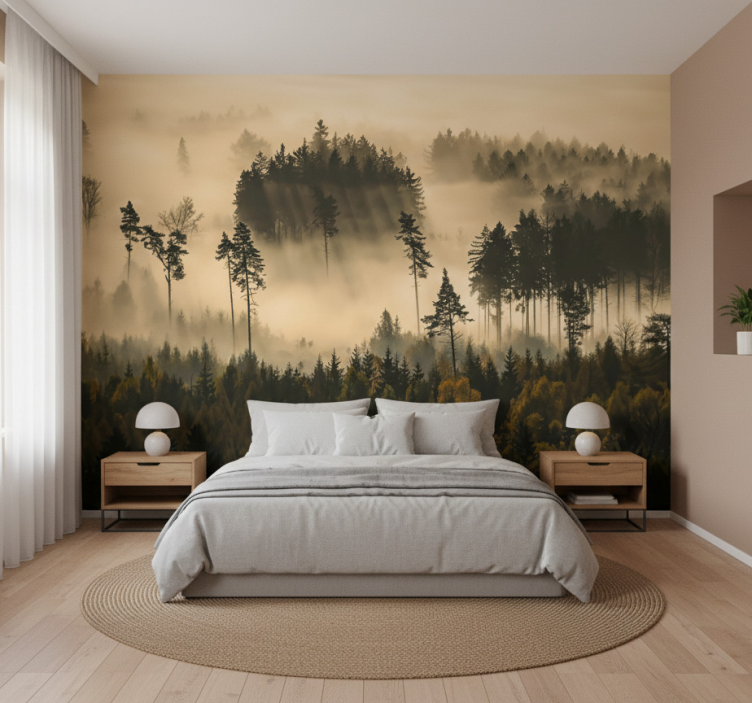 Mural de bosque bruma matutina etérea