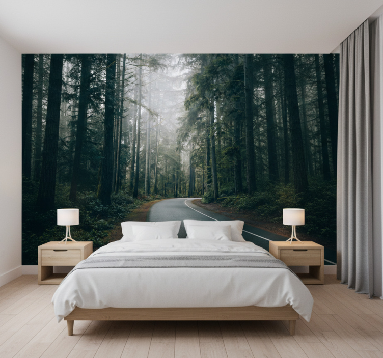Mural de bosque camino de pinos nebuloso