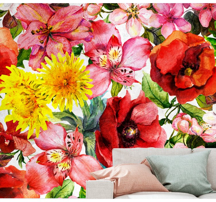 Descubre un mundo de color y vida con nuestro Mural de flores composición de flores vibrantes. Este diseño cautivador presenta una hermosa combinación de amapolas, flores silvestres, margaritas y rosas, todo realizado en un estilo de acuarela que parece cobrar vida en la pared. Cada detalle de este mural de flores transforma cualquier espacio en un jardín lleno de frescura y alegría.