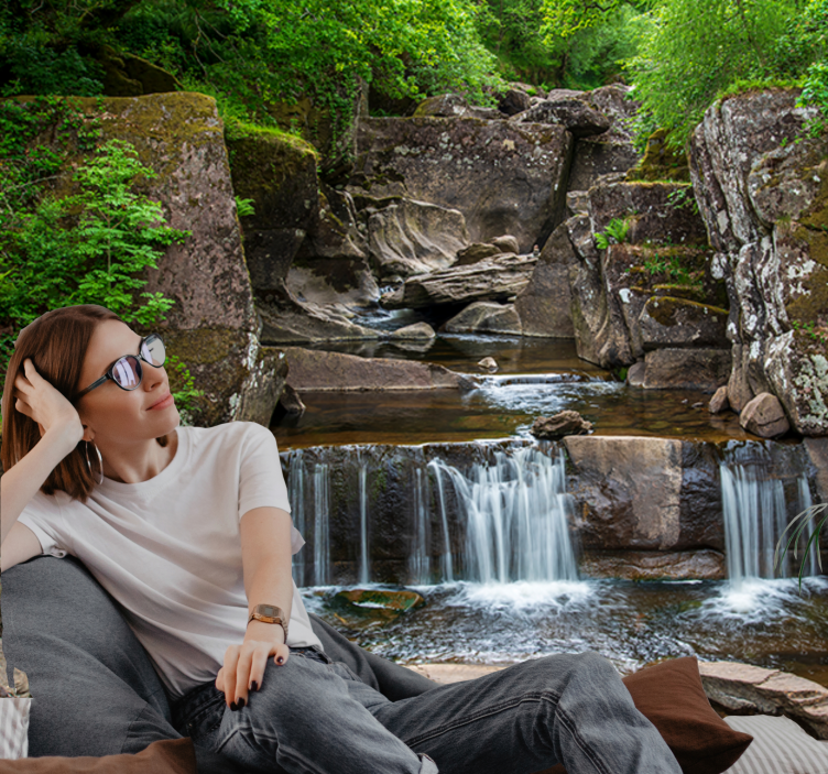 Sumérgete en la belleza natural con el Mural de montañas cascada de naturaleza serena, un diseño cautivador que muestra una cascada fluyendo entre rocas en un paisaje deslumbrante. Este mural evoca la tranquilidad de la naturaleza, rodeado de exuberante vegetación que promete transformar cualquier espacio en un refugio de paz y armonía.