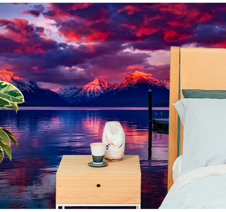Referencia: F11975Una vista impresionante de montañas imponentes se refleja en un lago sereno al atardecer, mostrando colores vibrantes en el cielo. La superficie tranquila del agua crea un efecto de espejo, enfatizando la grandeza del paisaje. Un muelle se extiende hacia la escena, invitando a la contemplación de la belleza de la naturaleza.