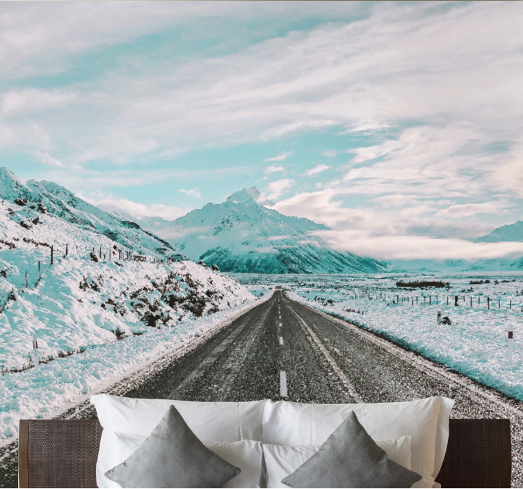 Transforma tu espacio con el Mural de paisajes sendero de montañas heladas, un diseño cautivador que evoca la serenidad del invierno. Imagina un paisaje nevado donde el camino serpentea entre majestuosas montañas, cubiertas de pura nieve, mientras nubes suaves flotan en el cielo. Este mural te transportará a un mundo de calma y belleza natural.