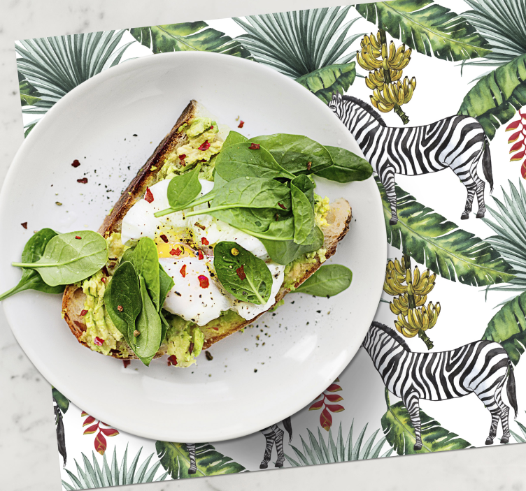 Descubre la fusión perfecta entre la naturaleza y la elegancia con nuestro Individual de mesa patrón hoja de cebra. Este impresionante diseño presenta un audaz estampado de cebra y hojas tropicales, evocando la exuberancia de la selva y la jungla. Con un acabado en acuarela que resalta el verdor y la textura de cada hoja, este mantel individual es una explosión de vida y color para tu mesa, ideal para quienes buscan un toque vibrante y contemporáneo en su decoración.