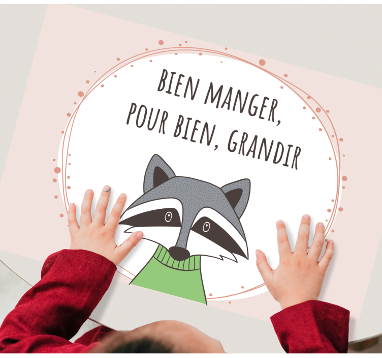 El diseño cuenta con un fondo de color crema, un círculo blanco y un mapache con un suéter verde. El texto te dice que comas bien, ideal para armonizar el aspecto de tus comidas informales en familia. A tus hijos les encantará.