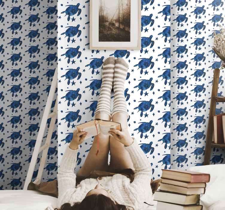 Descubre el maravilloso papel tapiz animales tortugas marinas azules, un diseño que captura la esencia del océano. Con un encantador patrón de tortugas y estrellas en un fondo azul, este estampado evoca la vida marina y llenará tus espacios de frescura y alegría. Ideal para quienes desean transformar su hogar en un refugio marino lleno de encanto.