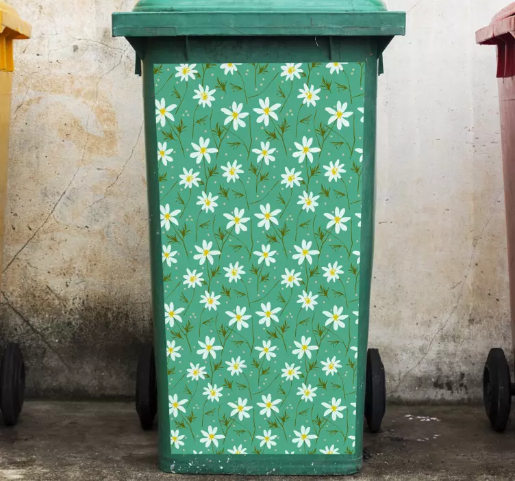 Descubre la Pegatina container patrón floral verde, una hermosa ilustración que evoca la frescura de la naturaleza. Con un encantador diseño que destaca margaritas y un patrón floral en tonos verdes, esta pegatina transformará cualquier espacio en un rincón lleno de vida. Su estampado vibrante y detallado captura la esencia de un jardín en plena floración, ideal para darle un toque único a tus ambientes.