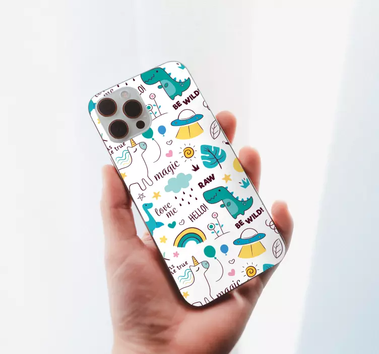 Descubre nuestra Pegatina iPhone patrones de criaturas fantásticas, un diseño único que combina la magia de los dinosaurios y un unicornio en un patrón vibrante y vistoso. Este estampado encantador transforma tu teléfono en una obra de arte llena de fantasía y lindo estilo, ideal para quienes desean dar un toque especial a sus móviles.