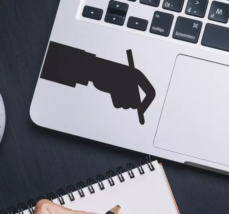La Pegatina para portátil mano sosteniendo lápiz es una obra de arte gráfica que captura la esencia de la creatividad. Con una silhouette de una mano sosteniendo un lápiz, esta pegatina está diseñada para inspirar a todos los que la vean. Su diseño en silhouette negra sobre un fondo claro resalta la figura de un ordenador portátil, creando una atmósfera artística y única. Perfecta para quienes desean personalizar su espacio de trabajo y mostrar su pasión por la escritura y el arte.