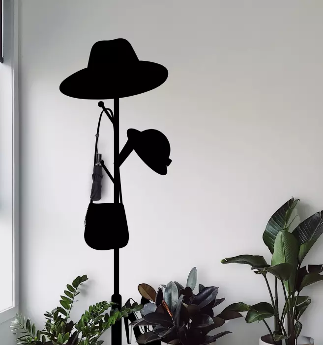 Referencia: A51372Este elegante y moderno perchero para sombreros presenta siluetas elegantes de diversas prendas para la cabeza y un bolso estiloso. Está diseñado para organizar y exhibir tus accesorios favoritos, aportando tanto funcionalidad como sofisticación a tu espacio.