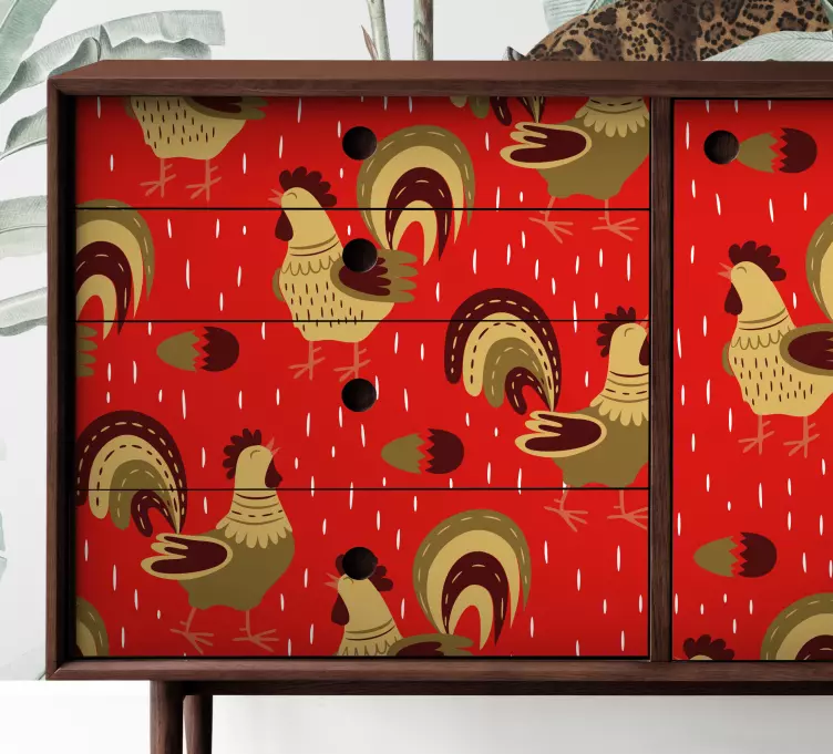 El Vinilo animal de granja patrón de gallo divertido es una explosión de color y alegría para tus espacios. Con un diseño que presenta gallos en un patrón encantador, esta ilustración es perfecta para darle vida a cualquier mueble o rincón de tu hogar. Su estampado vistoso en tonos de rojo y otros colores vibrantes evoca la esencia de la granja, convirtiéndolo en un elemento decorativo único que encantará a todos.