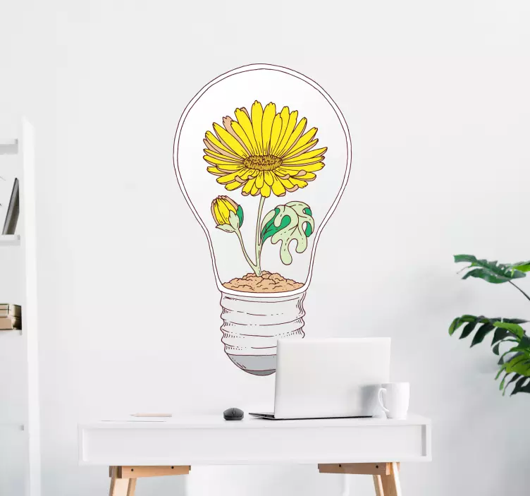 El vinilo bombilla floreciente es una hermosa ilustración que captura la esencia de la naturaleza mediante el diseño de una bombilla rodeada de girasoles y hojas vibrantes. Esta obra conceptual en tonos amarillos simboliza el crecimiento y la vida, aportando un toque de frescura y alegría a cualquier espacio. Con su estilo único, este vinilo transforma cualquier pared en un rincón lleno de energía positiva.