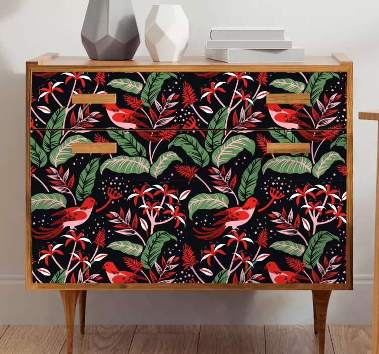 Descubre la belleza vibrante del vinilo concepto floral tropical, un diseño que captura la esencia de la naturaleza con su patrón llamativo. Este estampado incluye vistosas hojas y elegantes aves en un fondo de colores vivos como el rojo y el verde. Ideal para realzar cualquier mueble o espacio, esta obra de arte transformará tu hogar en un auténtico paraíso tropical.