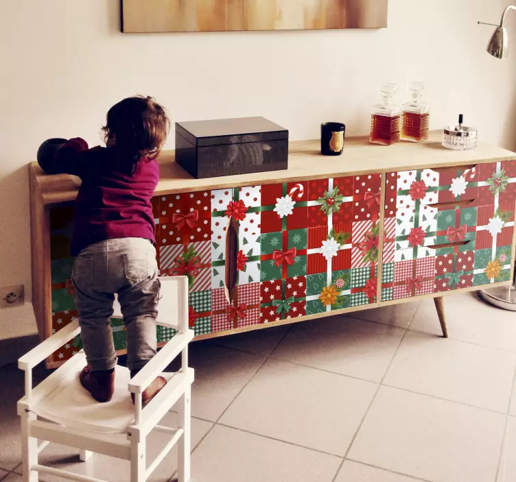 El vinilo embalaje de regalo celebratorio presenta un diseño alegre y festivo que incluye un patrón de muebles en tonos rojos y verdes, con lazos decorativos que evocan la magia de Navidad. Su cuadrícula y estampado al cuadrado añaden un toque divertido y vibrante, perfecto para embalar regalos y adornar cualquier espacio. Este producto es ideal para quienes buscan una manera única y creativa de celebrar cada ocasión especial.