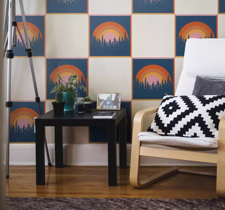 Transforma tu espacio con el Vinilo escena de bosque al atardecer, una obra de arte que captura la esencia de la naturaleza. Este diseño presenta un hermoso atardecer que brilla sobre un bosque vibrante, donde los colores cálidos se mezclan con la frescura del paisaje natural. El uso de azulejos en la composición añade un toque único, creando un ambiente acogedor y sereno que evoca la paz de un día que termina.