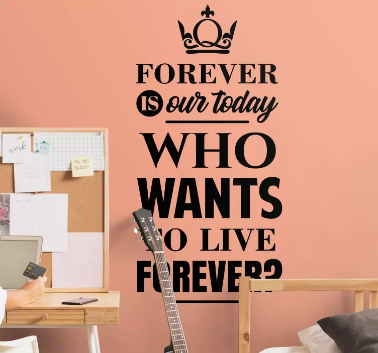 Para disfrutar del vinilo frase ¿quién quiere vivir para siempre?, simplemente utiliza cinta adhesiva de doble cara en la parte posterior para una sujeción perfecta. También puedes optar por enmarcarlo o usar chinchetas y blu-tack reutilizable. Aplica presión durante unos segundos y ¡listo! Tu decoración estará lista para brillar.
