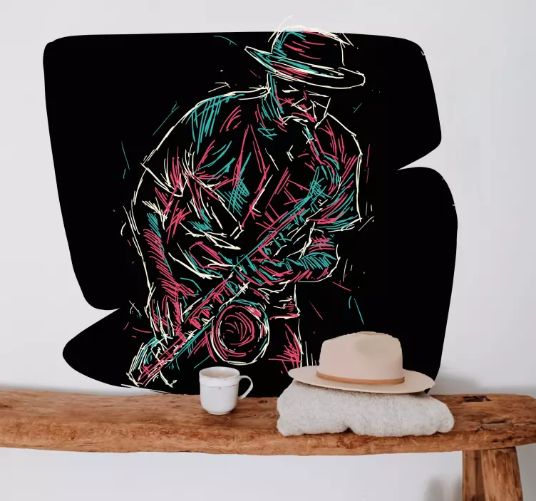 Descubre un mundo de creatividad y ritmo con nuestro Vinilo música saxofonista tocando, donde un músico de jazz cobra vida en un diseño abstracto que evoca la pasión de la música. Este llamativo dibujo presenta un saxofón en acción, un músico con un elegante sombrero y la energía vibrante del jazz, ideal para cualquier amante de la música que busque añadir un toque artístico a su espacio.