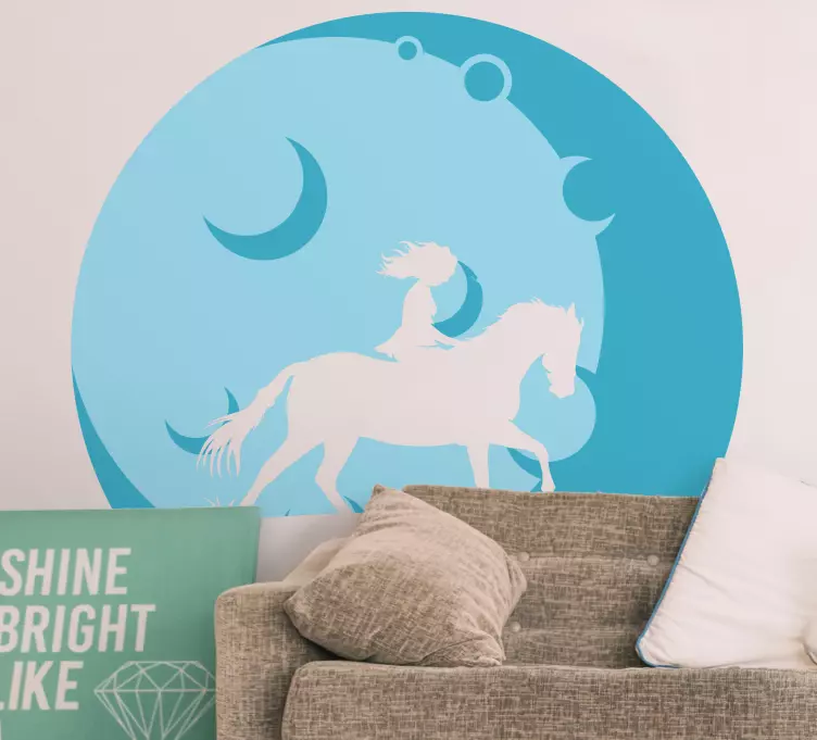 ¡Descubre un mundo de sueños y aventuras con nuestro vinilo de niña montando a caballo! Esta hermosa lámina decorativa presenta a una muchacha en una elegante silueta azul, acompañada de un magnífico caballo bajo la luz de una Luna brillante. Rodeada de naturaleza, esta ilustración captura la esencia de la libertad y la alegría, perfecta para embellecer cualquier habitación.