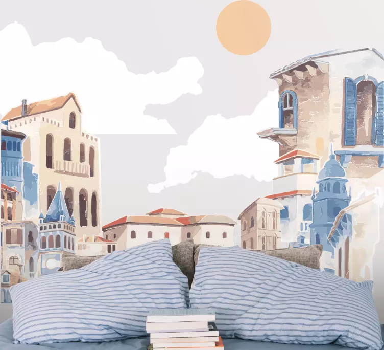 Descubre el vinilo paisaje urbano encantador, un diseño que evoca la belleza de un pueblo lleno de vida, donde los edificios se mezclan con la calidez del sol. Este cuadro en acuarela presenta un paisaje urbano donde la arquitectura se viste de azul y tonos cálidos, creando una atmósfera acogedora y vibrante que transformará cualquier espacio.