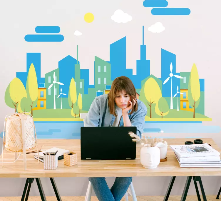 Descubre la belleza de la ciudad con nuestro vinilo paisaje urbano moderno, que presenta una impresionante ilustración de un paisaje urbano vibrante. Este diseño captura la esencia de una metrópoli contemporánea, con su silueta de rascacielos que se elevan hacia el cielo, rodeados de edificios icónicos, árboles verdes, un hermoso agua que refleja la luz del sol, y turbinas eólicas que simbolizan el futuro sostenible. ¡Un verdadero deleite visual para cualquier espacio!