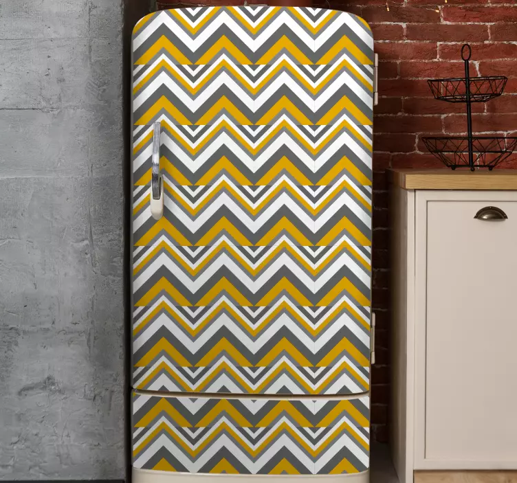 Transforma tu espacio con nuestro Vinilo para mueble diseño chevron, que presenta un atractivo gráfico nórdico en un patrón de zigzag elegante. Este diseño moderno combina triángulos en tonos amarillos y grises, creando un estampado vibrante que es perfecto para cualquier refrigerador, nevera, frigorífico o heladera. Dale un toque fresco y contemporáneo a tus muebles con esta pieza única que seguramente captará todas las miradas.