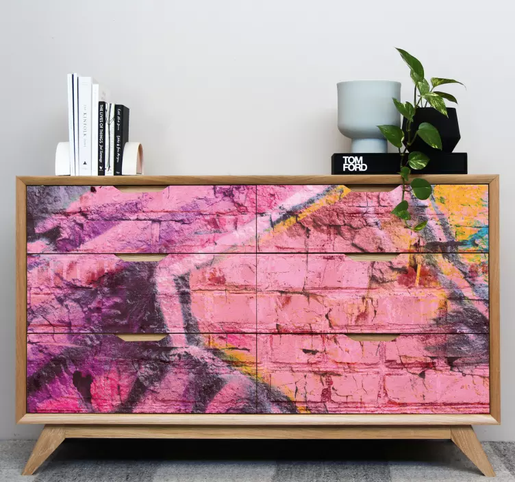 Descubre nuestro Vinilo para mueble estilo colorido y audaz, una pieza vibrante que transforma cualquier mueble en una obra de arte. Con un diseño que evoca una pared de ladrillo pintada y llena de graffiti, este vinilo ofrece una explosión de colores que incluye tonalidades de rosa y patrones geométricos. Su textura vistosa y artística agrega un toque único, perfecto para dar un nuevo aire a tus muebles y hacer que resalten en cualquier espacio.