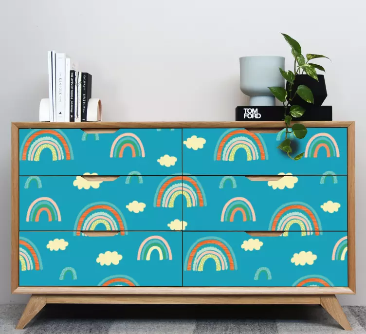 Transforma tus muebles con nuestro Vinilo para mueble patrones arcoíris coloridos, un diseño gráfico que resplandece con vibrantes arcoíris, suaves nubes y un patrón juguetón y caprichoso. Este estampado vistoso es perfecto para darle vida a cualquier espacio, convirtiendo tus muebles en verdaderas obras de arte que deslumbran y alegran el ambiente.