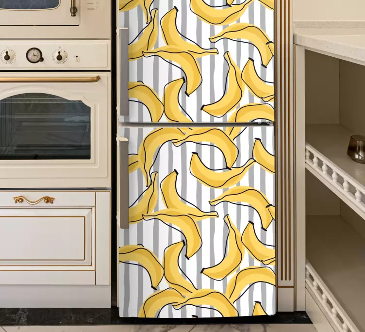 Transforma tu refrigerador en una obra de arte con nuestro vinilo para nevera estilo de plátano. Este divertido patrón de plátanos en tonos amarillos aporta un toque juguetón a tu cocina. La ilustración es perfecta para quienes buscan una manera original de decorar su nevera y hacer que cada apertura sea una experiencia alegre. ¡Deja que tu frigorífico exprese tu personalidad!