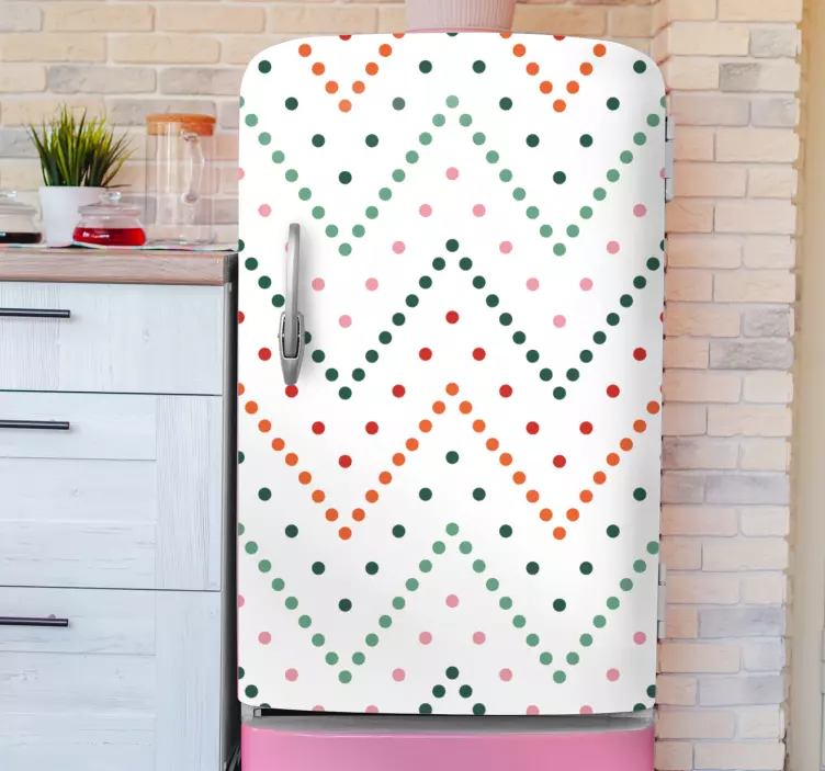 Descubre el Vinilo para nevera motivo chevron vibrante, una explosión de color y estilo para tu refrigerador. Este diseño moderno está compuesto por puntos, topos y zig-zag en una paleta multicolor que hará que tu nevera se convierta en el centro de atención de tu cocina. Con lunares y un toque vistoso, este vinilo es la opción perfecta para aquellos que buscan un toque contemporáneo y alegre en su hogar.