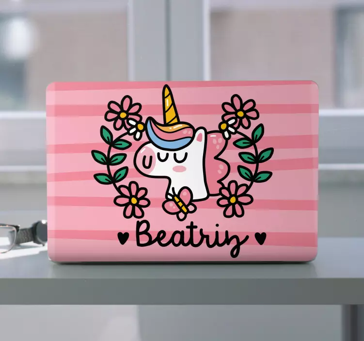 Descubre nuestro Vinilo para portátil diseño floral de unicornio, una obra de arte vibrante que combina tonos de rosa y rosado, adornada con un encantador unicornio rodeado de flores y rayas caprichosas. Este diseño es perfecto para personalizar tu ordenador portátil, haciéndolo más lindo y vistoso. Además, puedes agregar tu nombre y hacerlo verdaderamente personalizado. ¡Transforma tu dispositivo en una expresión de tu estilo único!