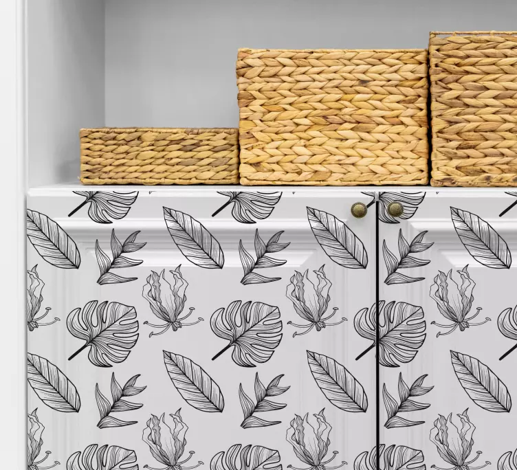 Descubre la elegancia del Vinilo planta patrones de hojas, un diseño que evoca la frescura de la naturaleza con un hermoso patrón de hojas tropicales. Este estampado en blanco y negro es perfecto para añadir un toque floral a tus muebles, transformando cualquier espacio en un oasis de tranquilidad y estilo. La combinación de la estética moderna con la esencia natural crea un ambiente acogedor y vibrante que encantará a todos.