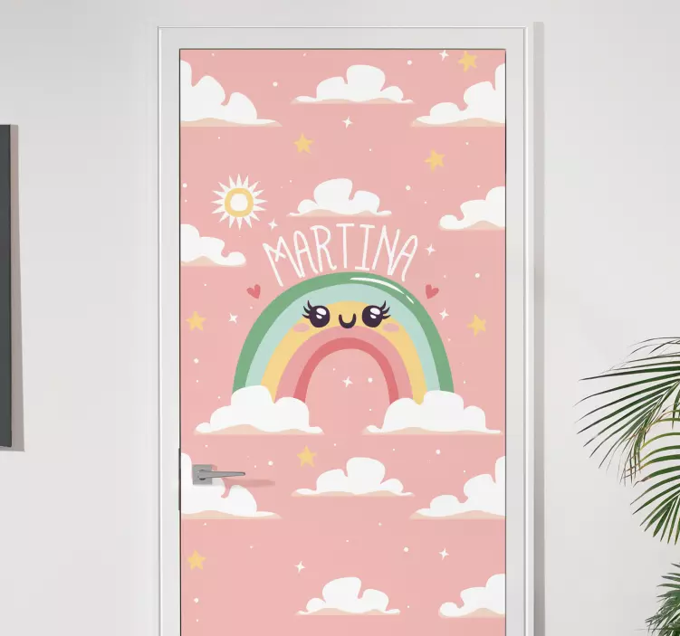 Transforma tu puerta con nuestro vinilo puerta diseño arcoíris personalizado, un adhesivo encantador que combina nubes esponjosas, un vibrante arcoíris y un sol radiante. Personaliza este diseño con tu nombre o el de tus seres queridos, creando un ambiente lindo y divertido que alegrará cualquier espacio. Su acabado satinado garantiza que los colores resalten sin deslumbrar, perfecto para iluminar tu hogar.