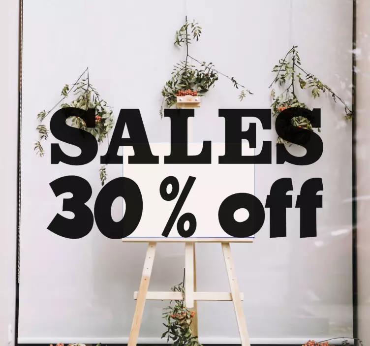 Descubre nuestro vinilo rebajas 30% de descuento, un adhesivo diseñado para atraer la atención en cualquier escaparate. Con un elegante diseño gráfico que incluye palabras clave como rebajas, ventas, y descuento, este vinilo es completamente personalizable para adaptarse a tus necesidades promocionales. Su acabado satinado evita reflejos, asegurando que el mensaje se vea claramente tanto en interiores como exteriores.