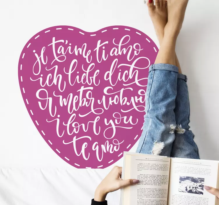 Descubre la belleza del Vinilo receta expresiones de amor sincero, una pieza decorativa que irradia amor y pasión. Este diseño cautivador combina un corazón lleno de amor con un texto caligráfico que expresa sentimientos profundos en varios idiomas. Su estilo plurilingüe y emotivo lo convierte en un elemento decorativo único, perfecto para aquellos que buscan algo diferente y romántico.